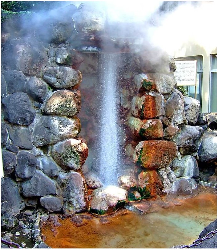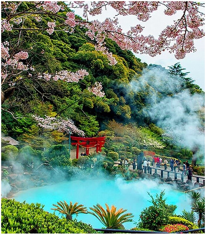 Umi Jigoku "Морське пекло" - найкрасивіше гаряче джерело кольором морської хвилі. Вода в джерелі сягає 94 градусів, про що свідчать курячі яйця, що продаються поруч. Їх на Ваших очах завантажують в сітчасту корзину, опускають у воду і через п'ять хвилин витягують звареними круто.