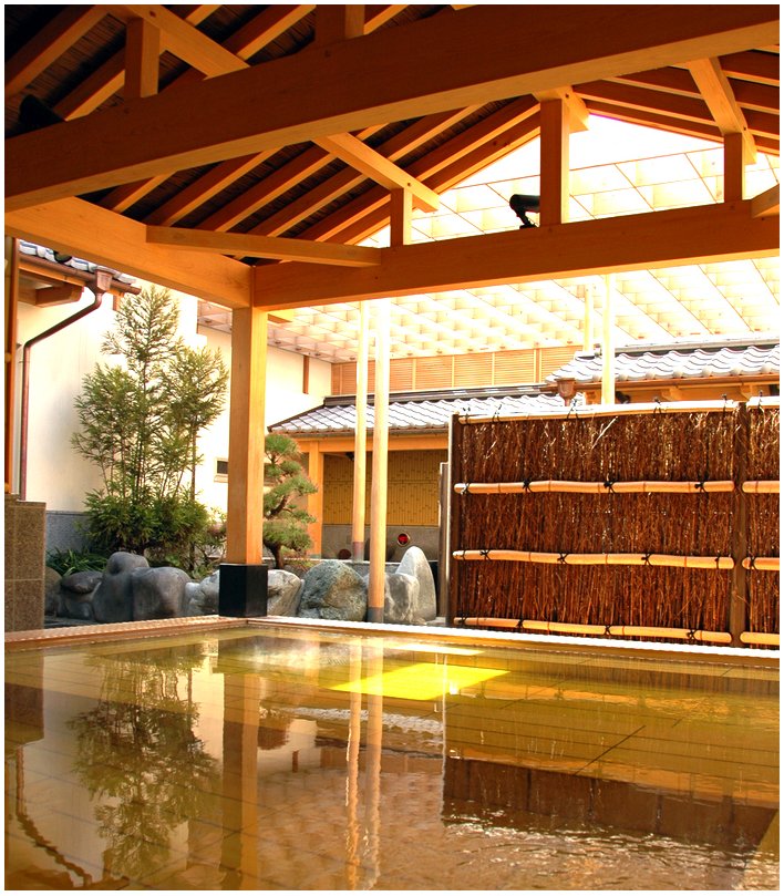 Після ванних процедур в ресторанчику джерела можна насолодитися прохолодними напоями, милуючись японським садком із ставком і кольоровими коропами.
