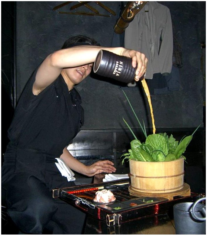 Подача кожного блюда - ціла вистава. Наприклад, при вас зварять суп, опустивши в дерев'яну каструльку розігріті до 400 градусів камені! А трохи пізніше ніндзя продемонструє деякі трюки і фокуси.