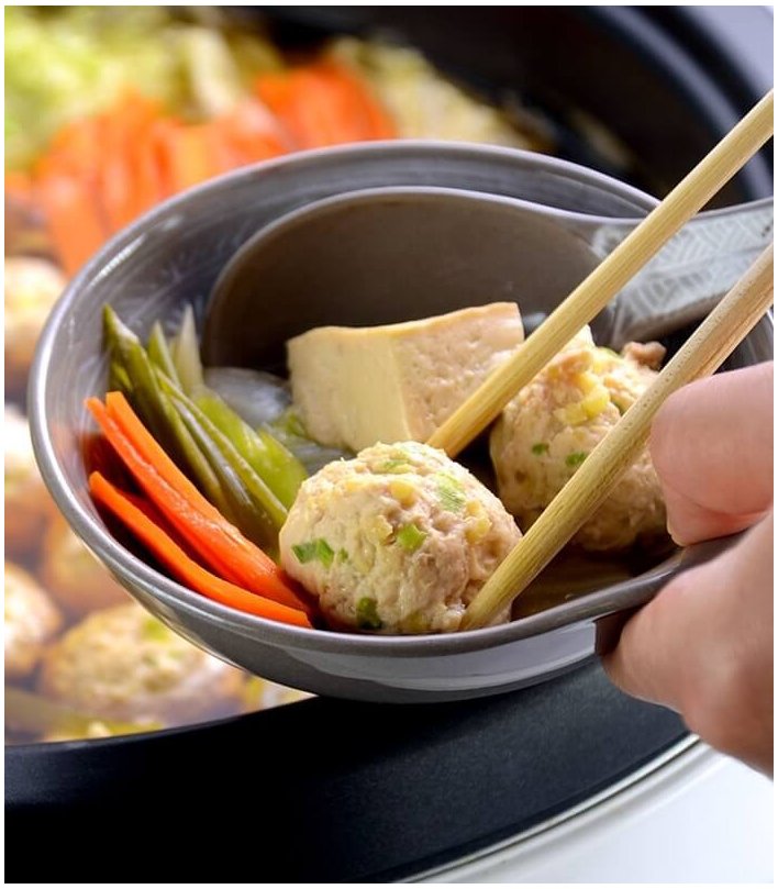 У середню каструлю з рибним бульйоном додайте соєвий соус, саке і мірін (солодке рисове вино за смаком). В цей час підготуйте фрикадельки зі свинини. Додайте до бульйону нарізаний дайкон і моркву і готуйте на середньому вогні 5-10 хв. Потім додайте фрикадельки і варіть 10-15 хв. після додавання грибів shiitake, зеленої цибулі nira, капусти, варіть ще 10 хв. Залишається зменшити вогонь і додати тофу. І вуаля - вечеря готова!